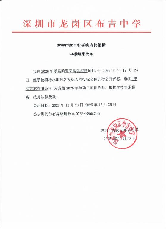 布吉中学2026年教职工生日福利采购项目招标公告更正