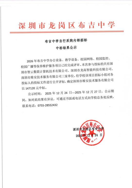 2026年布吉中学办公设备、教学设备、校园网络、校园监控、校园广播等保养维护服务项目中标公示