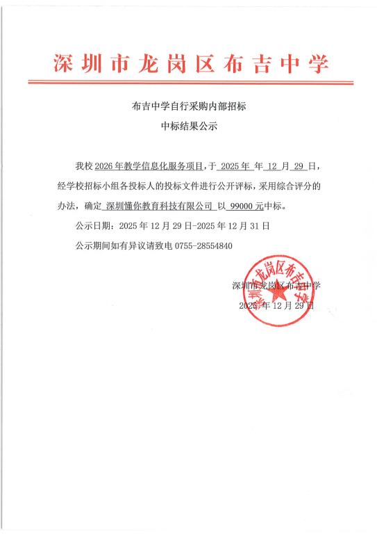 龙岗区布吉中学教学信息化服务项目采购招标公告及文件